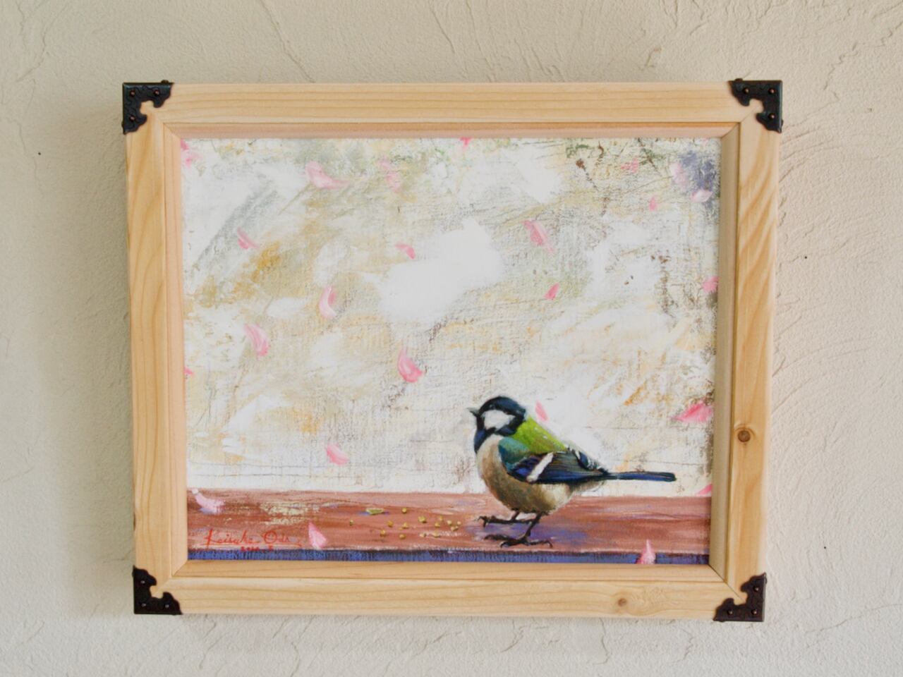 桜の花びらが舞い落ち、可愛らしいシジュウカラが優雅に舞う様子を描いた油絵作品、「Cherry blossom & Great tit(桜とシジュウカラ)」。繊細なタッチで描かれた花びらは、まるで風に吹かれて踊っているように見えます。その美しい色彩は、あなたのお部屋を一気に華やかに演出してくれることでしょう。