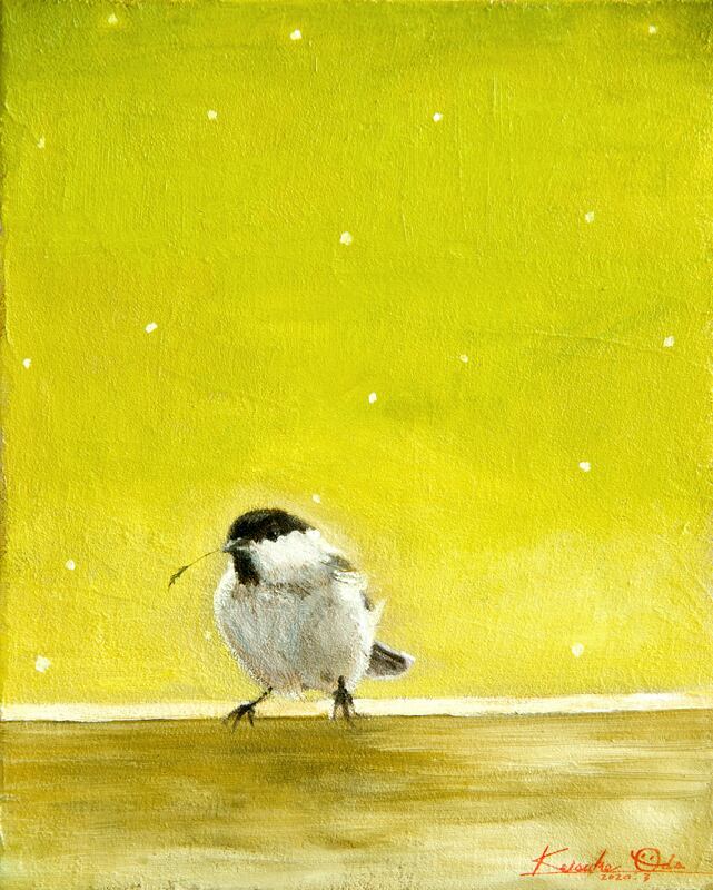 春の訪れを告げる野鳥のハシブトガラを描いた油絵「Spring has come !」。小枝を咥えた小鳥が春の風を運んできてくれるかのようです。