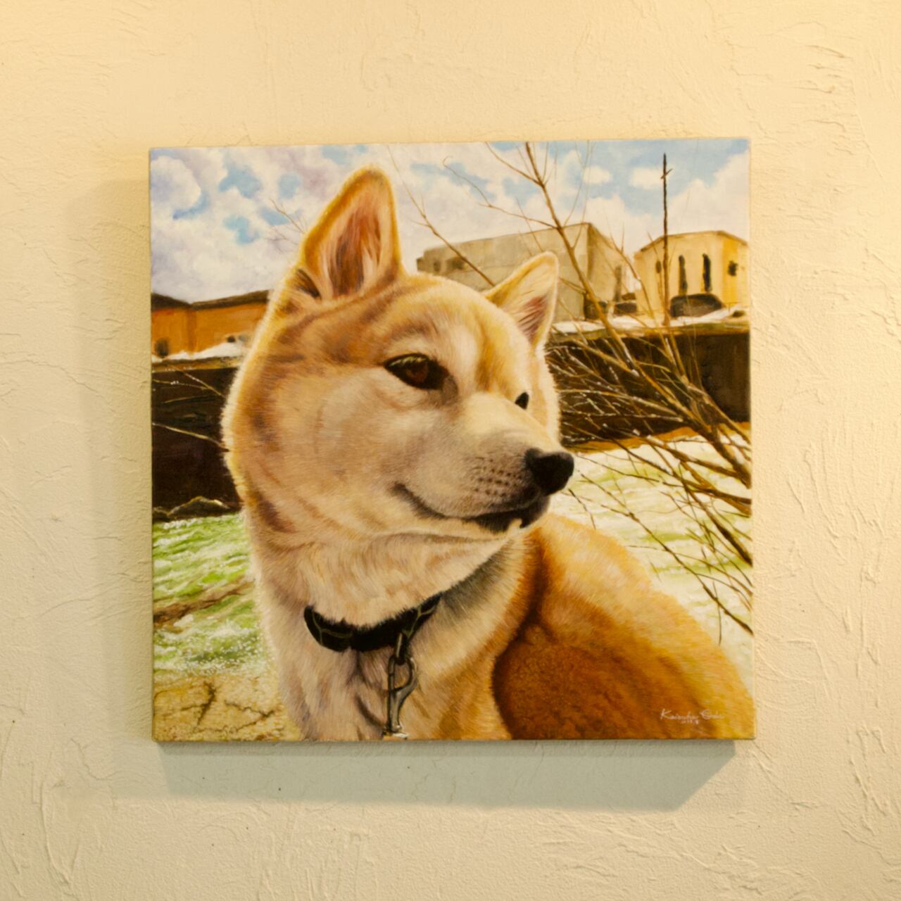 雪解け水が流れる春の河と暖かい日差しをを浴びる柴犬の姿が描かれた油彩画「春の河原」。この作品は、季節の移り変わりと共に心を温かくしてくれる、癒しのアートです。